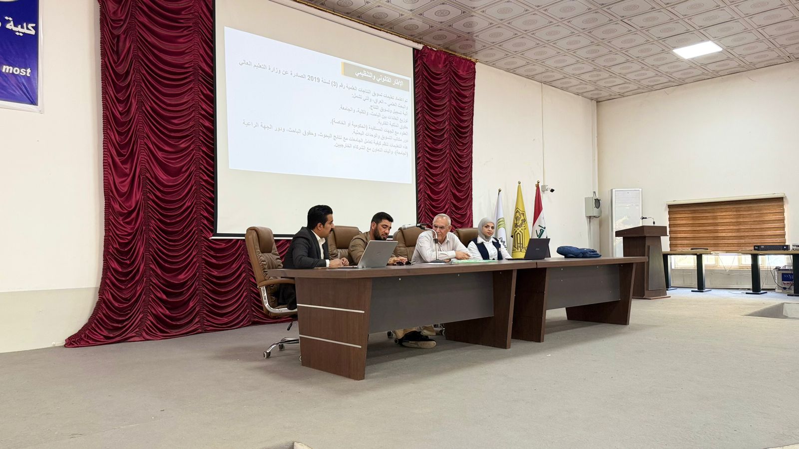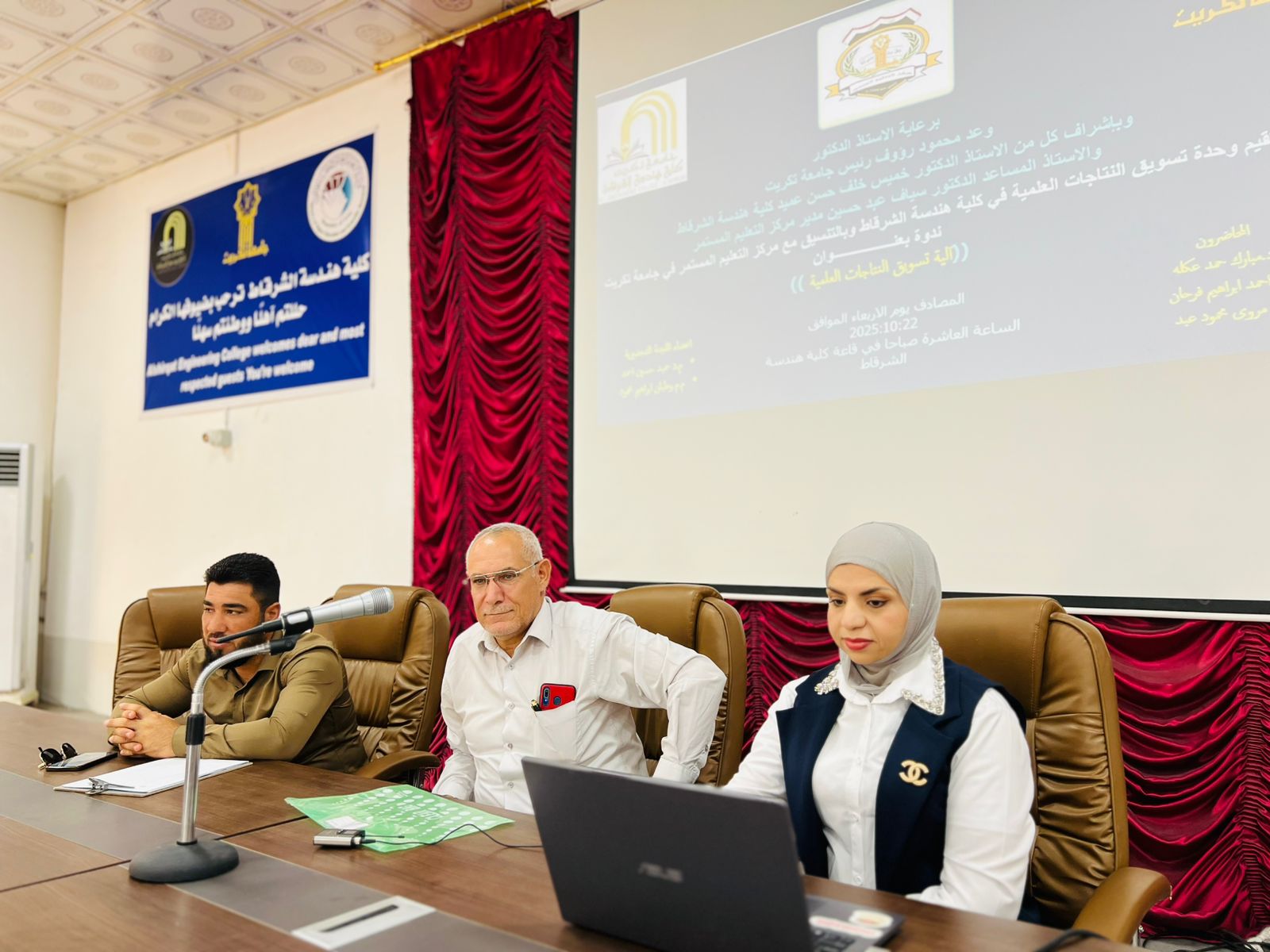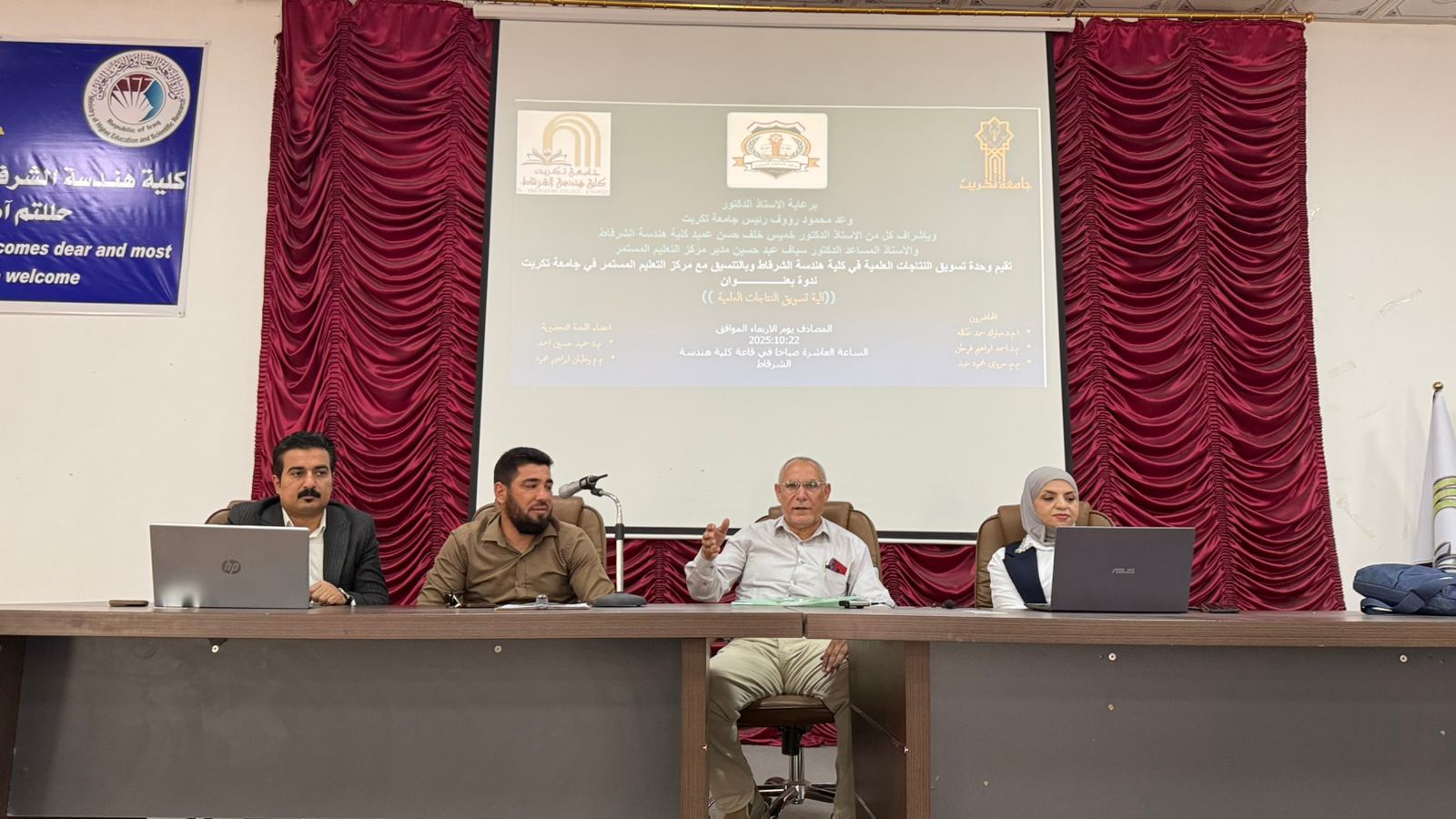 برعاية الأستاذ الدكتور وعد محمود رؤوف، رئيس جامعة تكريت، وبإشراف الأستاذ الدكتور خميس خلف حسن، عميد كلية هندسة/الشرقاط، نظّمت كلية هندسة الشرقاط بالتعاون مع قسم الشؤون العلمية في رئاسة الجامعة، ندوةً علميةً بعنوان "آلية تسويق النتاجات العلمية"، يوم الاربعاء الموافق 22 / 10 / 2025، في تمام الساعة العاشرة صباحًا على قاعة المرحوم الدكتور هاني هادي.